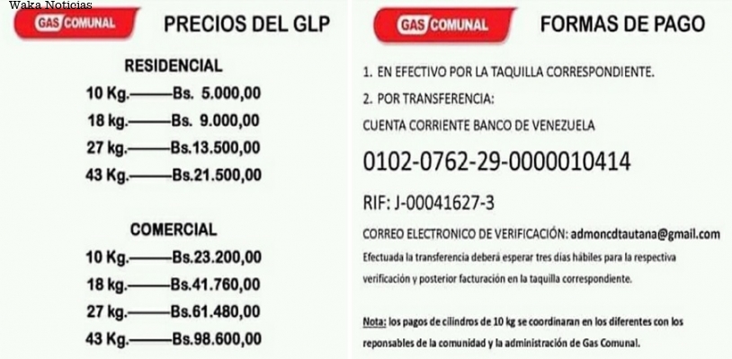(Waka Noticias. Puerto Ayacucho, 10/09/2019).- Desde el pasado lunes 2 de septiembre la empresa Pdvsa Gas Comunal, refundada ahora como Gas Comunal Amazonas por parte del Gobernador del Estado, estableció la nueva tarifa de venta de gas en sus diferentes presentaciones, tanto para la zona residencial como la comercial.