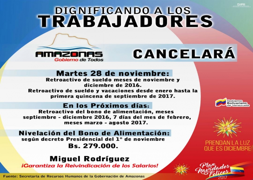 Gobernación de Amazonas cancela deudas del año 2016 y 2017 y nivela cesta ticket a 279.000 bs.