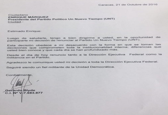 El alcalde del Municipio Baruta, Gerardo Blyde, renunció a la dirección ejecutiva y a militancia del partido UNT en un documento enviado al presidente del partido Enrique Márquez.