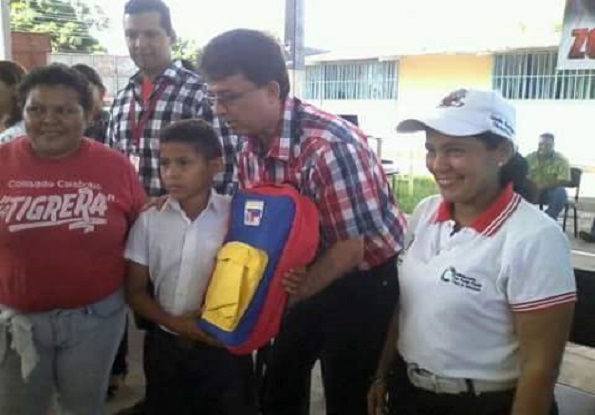 Bolsos con un kit escolar moral y útiles escolares, (1 cartuchera con 2 lápices, 2 sacapuntas, 1 borrador, 1 libreta, 1 caja de colores, 1 juego de geometría con 1 compas y 4 textos de la Colección Bicentenario: Lengua, Matemática, Ciencias Naturales y Ciencias Sociales) son parte de los implementos de estudio que entregaron representantes del Gobierno Nacional en el estado a los estudiantes de 6to grado de 23 escuelas nacionales y estadales para el inicio del año escolar 2016-2017.