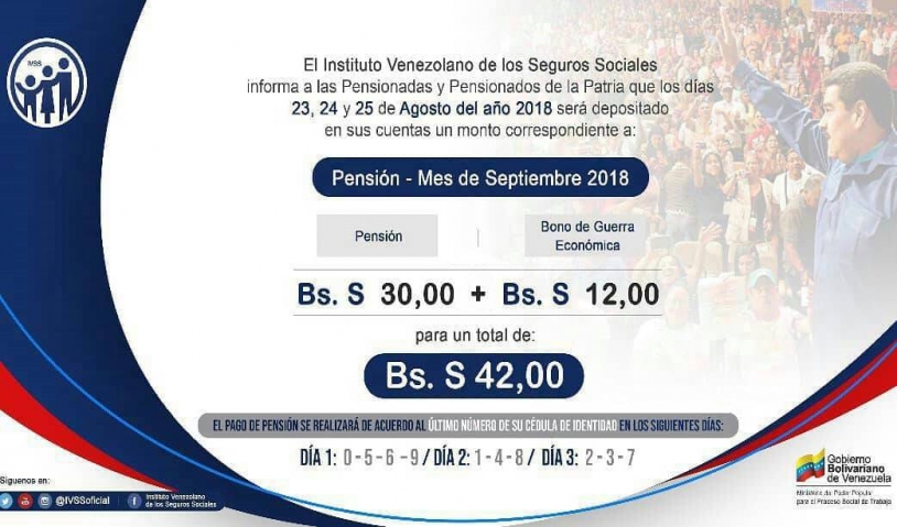 De igual forma el seguro social a través de su cuenta de Twitter @IVSSoficial informó que los pensionadas y pensionados de la #Patria los días 23, 24 y 25 de agosto del año 2018, será depositado en sus cuentas la pensión correspondiente al mes de septiembre.