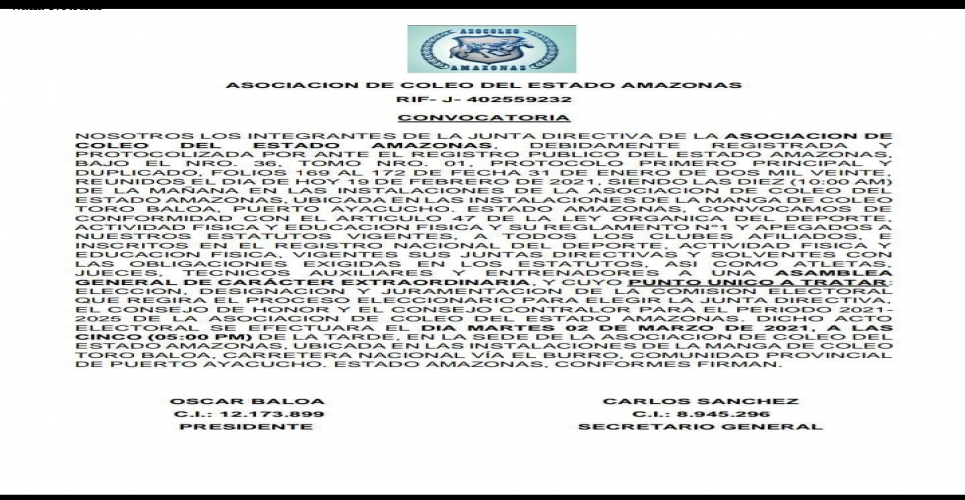 LA ASOCIACION DE COLEO DEL ESTADO AMAZONAS REALIZA UNA CONVOCATORIA Publicado: Viernes, 19 Febrero 2021 23:05 | Escrito por Magno Alejandro Barros | Visto: 1801 Tweet WhatsApp