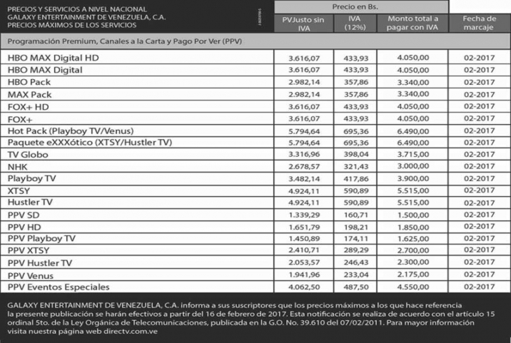(waka Noticias) 16/02/17. Directv Venezuela informó sobre los nuevos costos que a partir de este 16 de febrero tendrán las tarifas de sus paquetes prémium así como los precios de la programación exclusiva para el entretenimiento del público adulto.