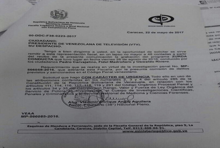 "Tengo a bien dirigirme a usted, en la oportunidad de solicitar se sirva remitir a esta representación fiscal, en un lapso no mayor a 48 contadas a partir del recibo de la presente comunicación la grabación del programa Zurda Conducta que tuvo lugar en fecha viernes 26 de agosto de 2016, conducido por los ciudadanos Pedo Carvajalino, Fidel Madroñero y Oswaldo Rivero".