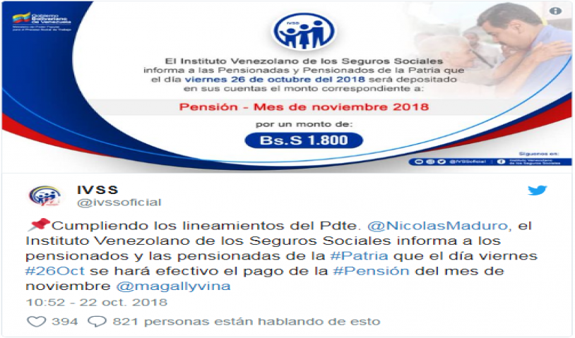 El anunció se dio a conocer a través de la cuenta oficial en la red social Twitter del Instituto Venezolano de los Seguros Sociales (IVSS), donde se destaca que todos los beneficiarios podrán disponer a partir de este viernes el monto de 1.800 bolívares soberanos, para retiros en las entidades bancarias, además de realizar operaciones a través de la banca electrónica con tarjetas de débito.