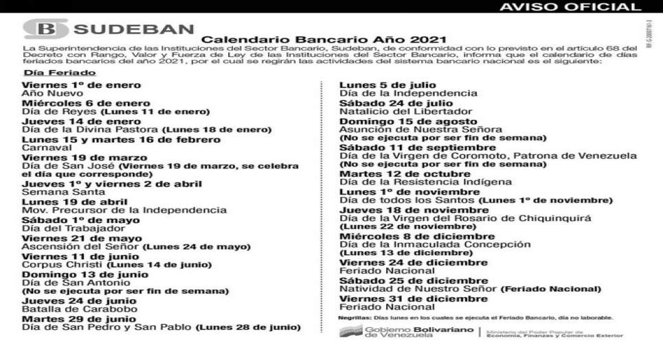 (Waka Noticias. Puerto Ayacucho, 30/12/2020).- La Superintendencia Nacional de las Instituciones del Sector Bancario, Sudeban, dio a conocer el Calendario Bancario que regirá para el año 2021, el cual recoge todas las fechas en las cuales no habrá actividad en la red bancario nacional.