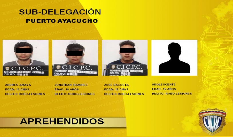 Según la cuenta oficial del Cicpc sub delegación Puerto Ayacucho, fueron capturados cuatros personas, cuando perpetraban un robo en la institución educativa del liceo “Marahuaca” ubicado en la vía Aeropuerto frente al Cirmil militar.