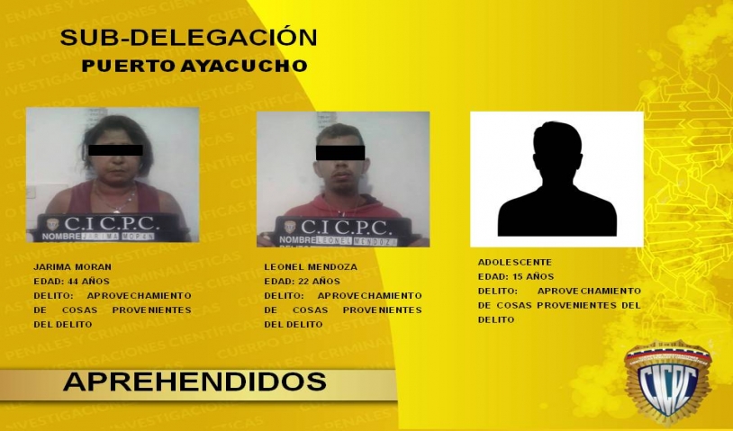 De acuerdo a información del twitter del Cicpc de la sub delegación de Puerto Ayacucho, tres ciudadanos fueron aprehendidos por el delito de aprovechamiento de cosas provenientes del delito.