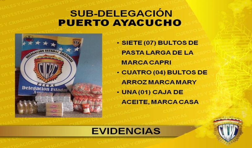 Los ciudadanos detenidos son Jarima Moran de 44 años de edad, Leonel Mendoza de 22 años y un adolecente de 15 años de edad, las evidencias de delito son; siete (7) bultos de pasta marca Capri, cuatro (4) bultos de arroz marca Mary, una (1) caja de aceite marca Casa.